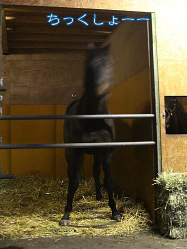 チャンプが厩舎に積まれた牧草を盗み食いしている間に、