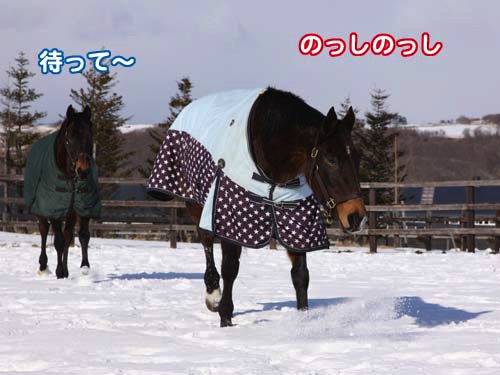チャンプも雪が積もったパウダースノーの放牧地は歩きやすいようでご機嫌です。