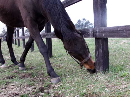 チャンプが厩舎に積まれた牧草を盗み食いしている間に、